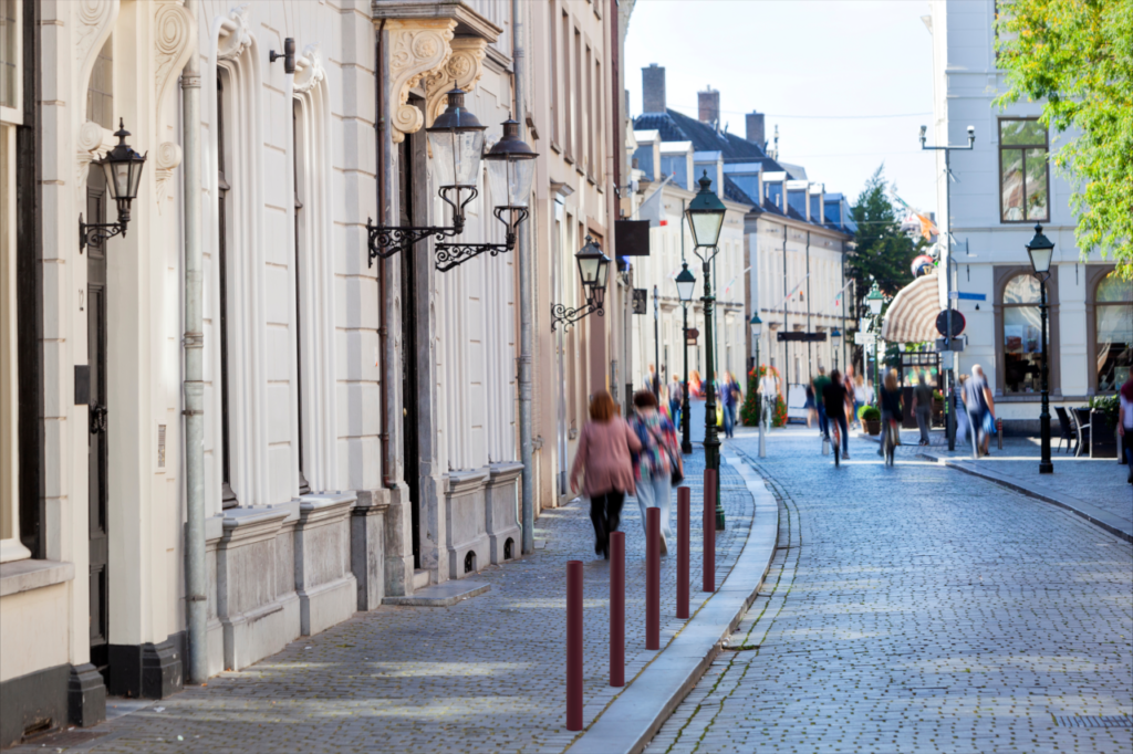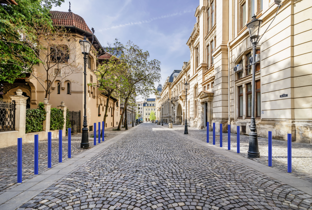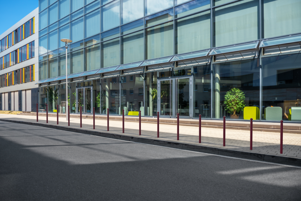 - Potelet à tête boule, système d’ancrage au sol intégré au potelet